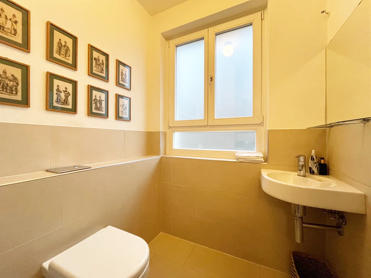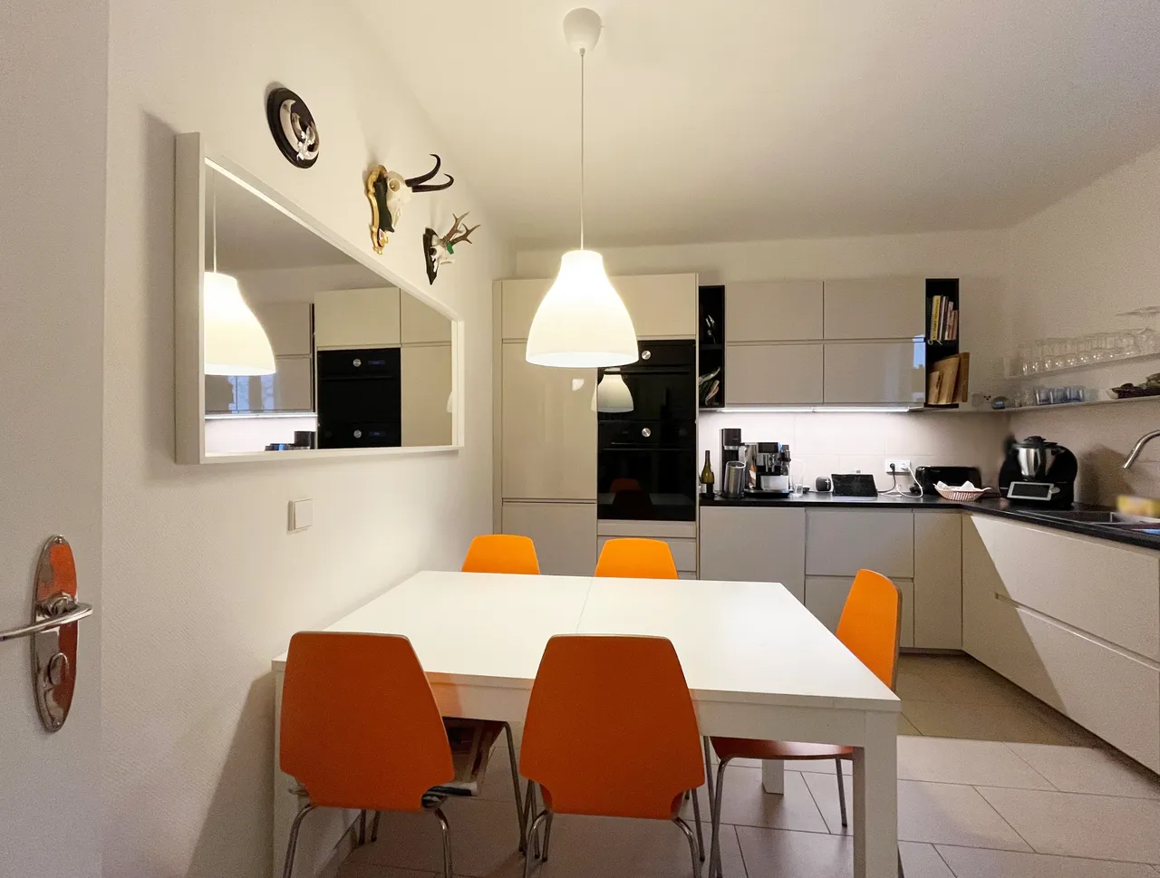 Die moderne Küche im Erdgeschoss ist großzügig geschnitten und mit einer hochwertigen Einbauküche (EBK) ausgestattet, die unter anderem über zwei Backöfen (bzw. eine Backofen-Mikrowellen-Kombi) und ein Induktionskochfeld mit integriertem Dunstabzug verfügt. Zudem gibt es ausreichend Platz für einen kleineren Esstisch, an dem auch schnelle Mahlzeiten gemütlich eingenommen werden können. Eine separate Gäste-Toilette rundet das Erdgeschoss als "öffentlichen Bereich" ab.