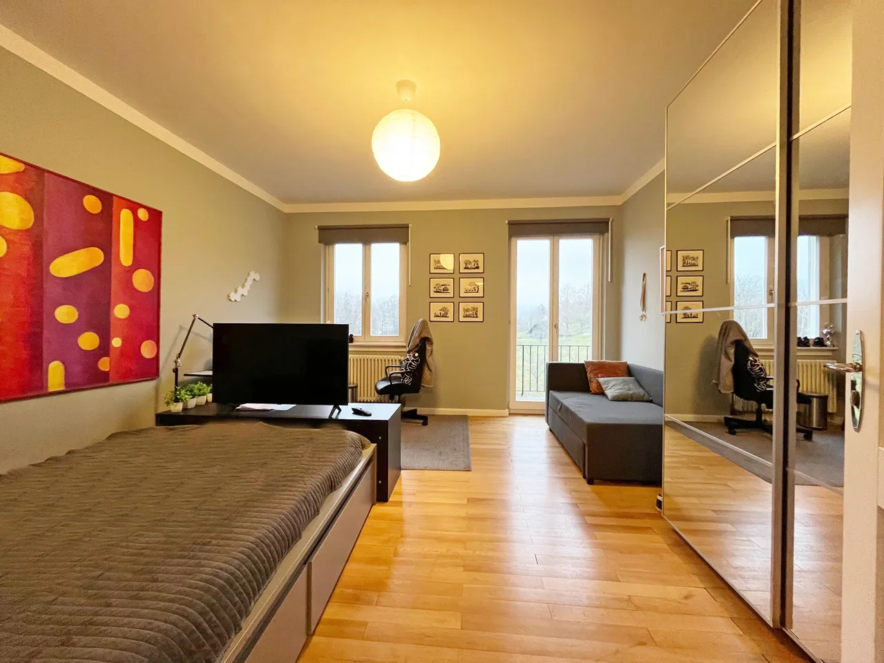 Das im Jahr 1936 erbaute Gebäude begeistert durch seine durchdachte Architektur und die liebevollen Details, wie beispielsweise maßgefertigte Innentüren von einem renommierten Schwarzwälder Schreiner, restaurierte Türbeschläge aus vernickeltem Messing, elegante Holztreppen, hochwertigen Fischgrät-Parkettboden im Erdgeschoss und vieles mehr.