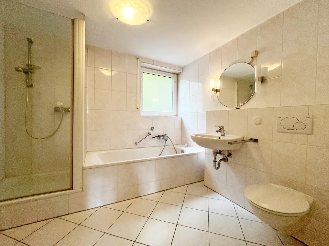 Das Tageslichtbadezimmer ist neben einer Dusche auch mit einer Badewanne ausgestattet und befindet sich linker Hand der Diele. Abgerundet wird das Immobilienangebot durch eine Gäste-Toilette, einen Hauswirtschaftsraum in der Wohnung sowie durch einen Kellerabteil und einen Außenstellplatz.
