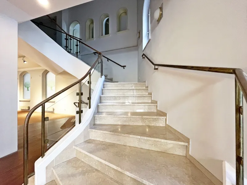 Der repräsentative Treppenaufgang, eine Marmortreppe, verleiht diesem Stockwerk eine besondere Note und wirkt somit äußerst repräsentativ.